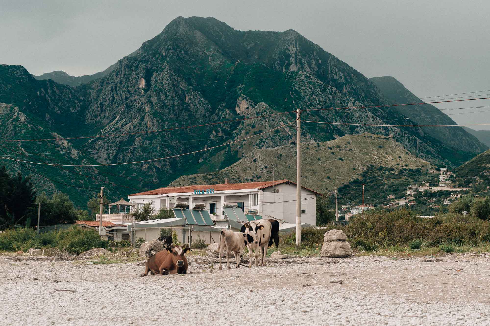 Le seul arrêt digne de ce nom que nous avons fait était à la plage de Borsh. Je ne me souviens plus de la raison exacte pour laquelle nous l’avons choisie entre toutes les autres plages, mais l’expérience a été presque irréelle—une immense plage vide, des hôtels construits à moitié dont les structures pointaient parmi les arbres, et des vaches qui léchaient leurs veaux, là, sur le sable. Il faisait trop froid pour nous baigner, mais le paysage était magnifique, malgré une certaine note de mélancolie.
