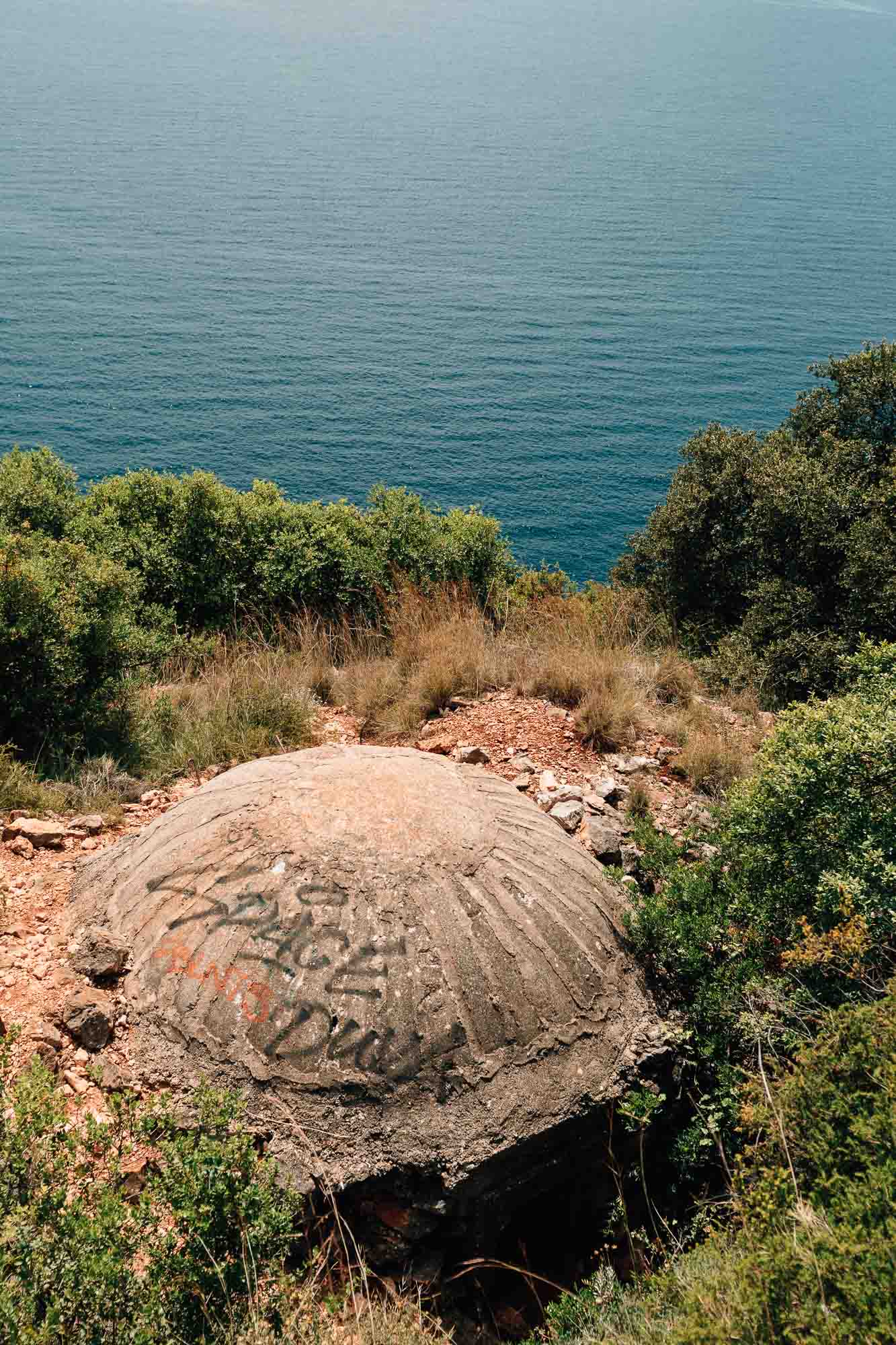 On peut se demander pourquoi le nom du parc est si, euh, vague, voici l’explication : il est situé dans une zone militaire autrefois très protégée, et dans certains aspects, elle l’est toujours. Nous avions lu dans un guide qu’il y avait une base navale supposément intéressante à voir, nous avons donc décidé d’aller la visiter. Pas de chance ; il semble que les choses aient changé ici aussi. Cependant, à notre arrivée, nous avons découvert un parc archéologique—le troisième de notre voyage ! Avant d’entrer dans la zone, nos passeports ont été pris et il nous a été interdit de prendre des photos de la route, mais le parc restait ouvert aux visiteurs tout de même. C’est étrange, je suis d’accord. Mais honnêtement, l’endroit est magnifique. La péninsule de Karaburun est une région sur la côte albanaise avec une nature superbe – avec des baies, des vallées verdoyantes et des vues à couper le souffle. Si seulement Hoxha n’avait pas décidé d’y installer ses bases militaires ! Je n’ai pas trouvé beaucoup d’informations en ligne sur ce parc, donc si vous êtes d’humeur pour une mini-aventure, lancez-vous !