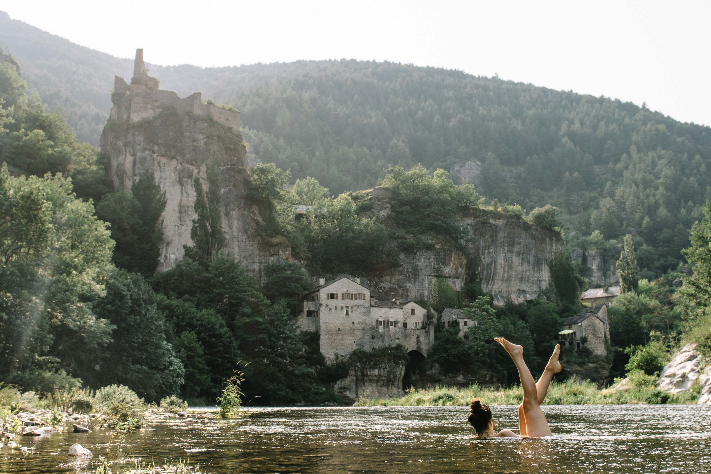 Sur le chemin du retour vers Toulouse, nous n’avons pas pu nous empêcher de faire une pause baignade à Castelbouc – un village sublime ! Nous étions toujours en Lozère, mais dans un endroit un peu différent – dans les Gorges du Tarn. Notre tout premier article de blog parlait du voyage dans les Gorges du Tarn il y a huit ans – cet endroit mérite absolument une visite séparée. Ainsi, Castelbouc n’est qu’un des spots fantastiques du Tarn. Un autre était Sainte-Enimie, sa place parmi les “plus beaux villages de France” est entièrement méritée aussi. Nous en avons visité un bon nombre cette fois-ci !