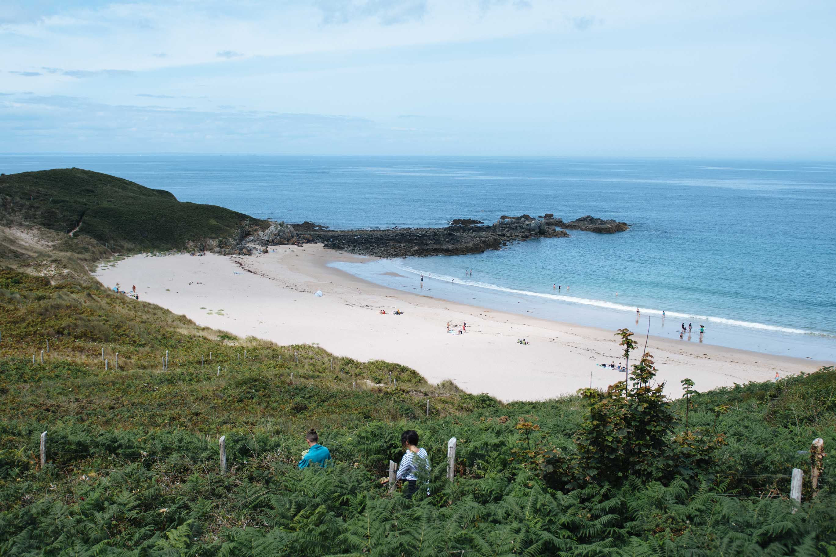 Notre objectif suivant était de trouver un endroit pour camper. Le camping était notre seul type d’hébergement pendant tout ce voyage – financièrement, pour cinq personnes en pleine saison touristique, c’était l’option la plus raisonnable. Franchement, je n’en aurais pas voulu d’autre de toute façon. Au fil des ans, nous avons eu tellement de beaux emplacements de camping que j’ai perdu le compte, mais deux me viennent immédiatement à l’esprit : celui d’Yport en Normandie et le Camping du Pont de l’Etang sur le Cap Fréhel. Des dizaines de tentes sur la dune parmi les pins – c’était incroyable. Il y avait aussi un accès à la plage de l’Anse du Croc, donc notre matinée a commencé par une baignade dans les vagues fraîches…