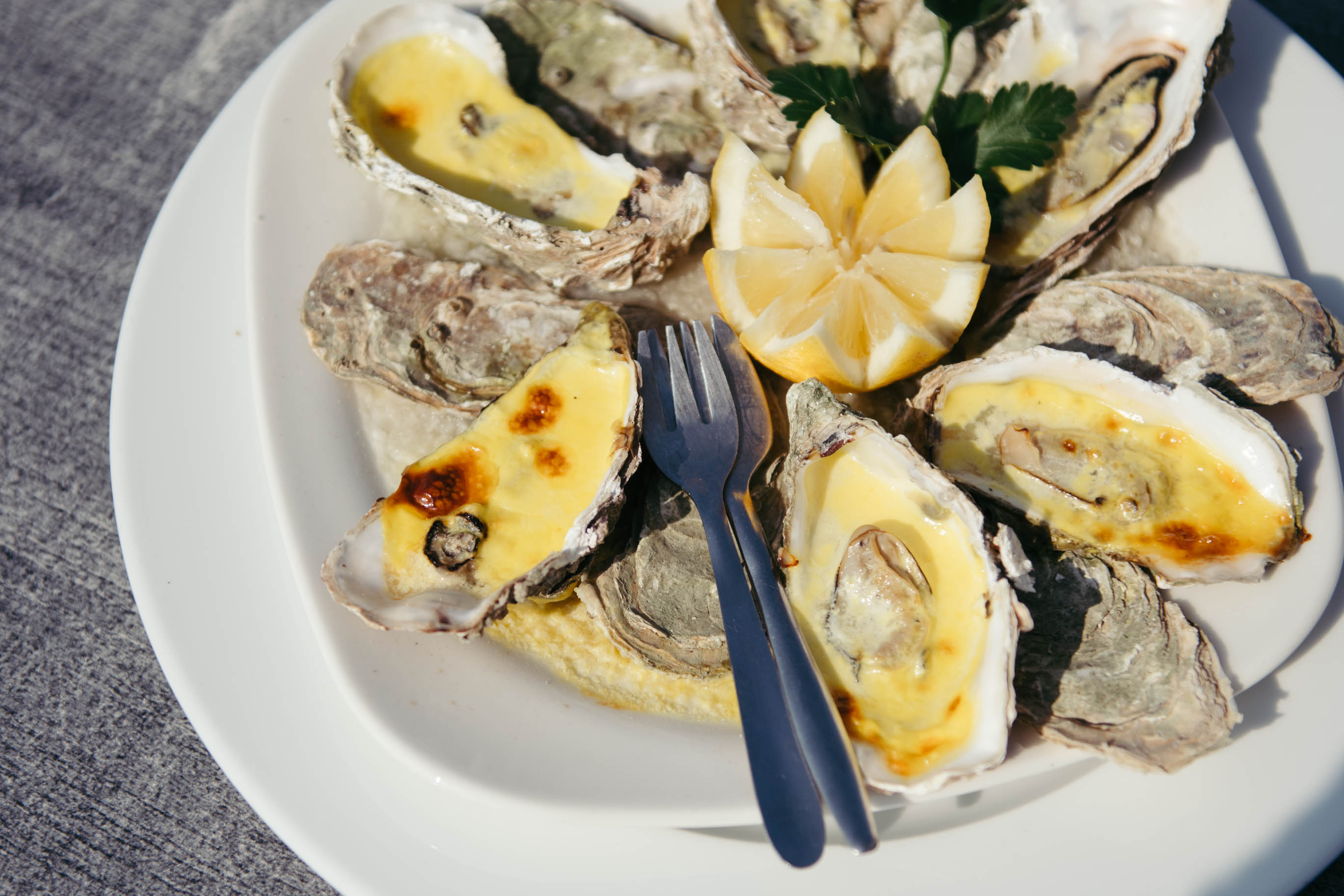 Un peu plus loin, à Agon, nous nous sommes offerts la première de nombreuses assiettes d’huîtres de ce voyage. Pendant notre séjour en Normandie, nous les avons dégustées de mille et une façons, mais ces huîtres cuites au four avec des épices semblaient avoir été envoyées directement du paradis.